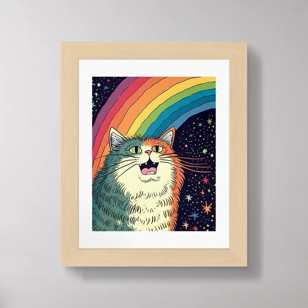 An adorable fluffy cat in space with a rainbow in a retro style AI generated art