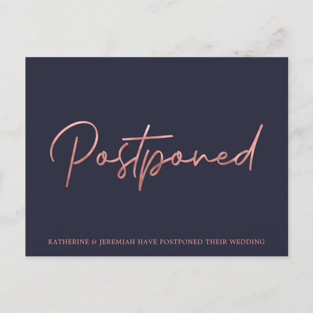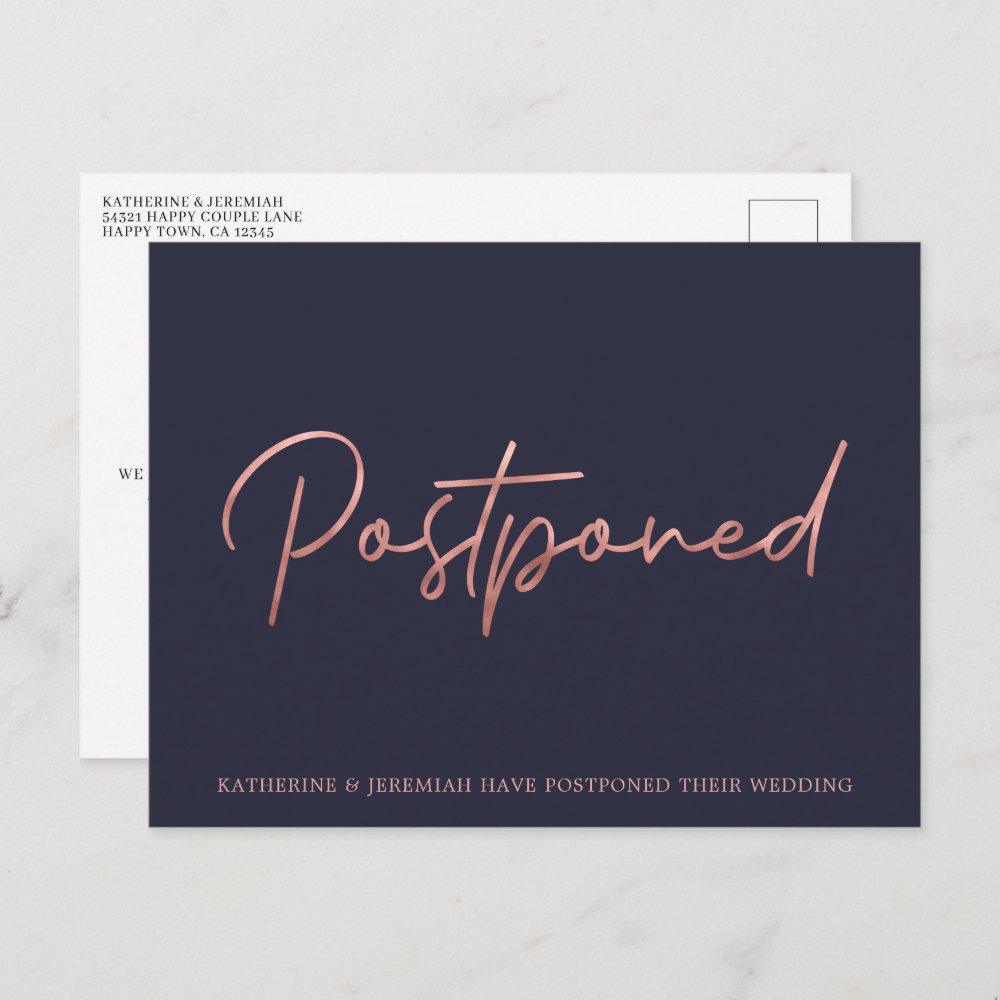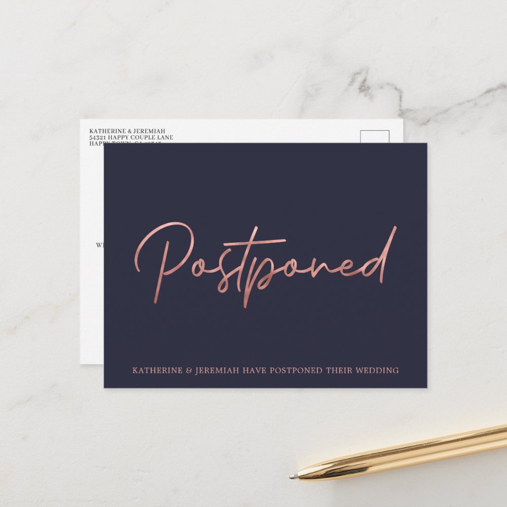 Navy Blue Rose Gold Foil Wedding Postponement Postcard
