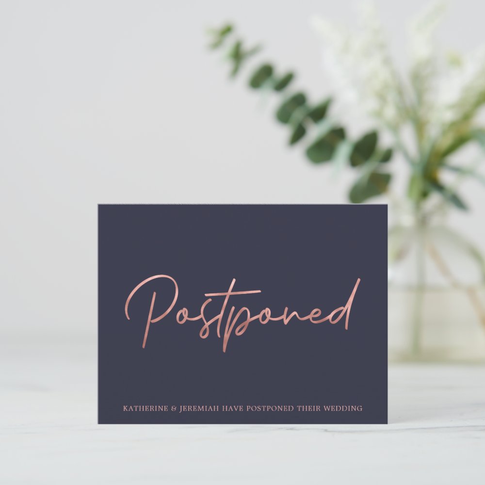 Minimalist Rose Gold Foil Wedding Postponement or Date Change Postcard featuring trendy script lettering in faux rose gold foil on a navy blue background to let your guests know that your plans have changed. If you need assistance or matching items, please contact us at cedarandstring@gmail.com