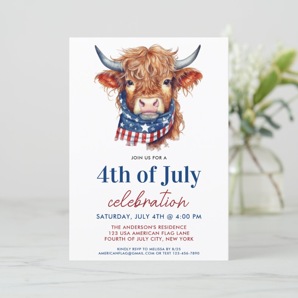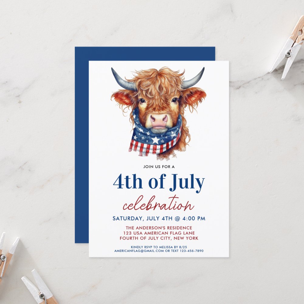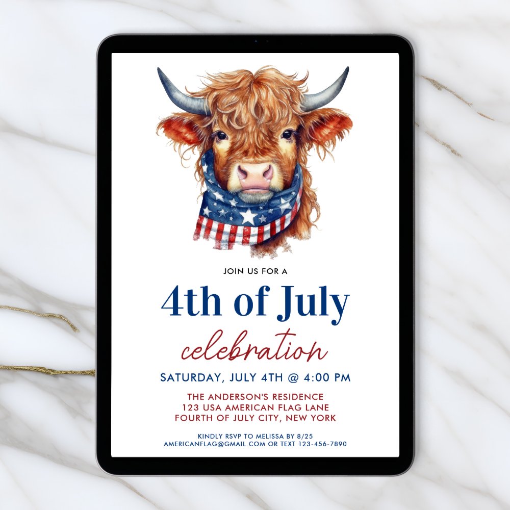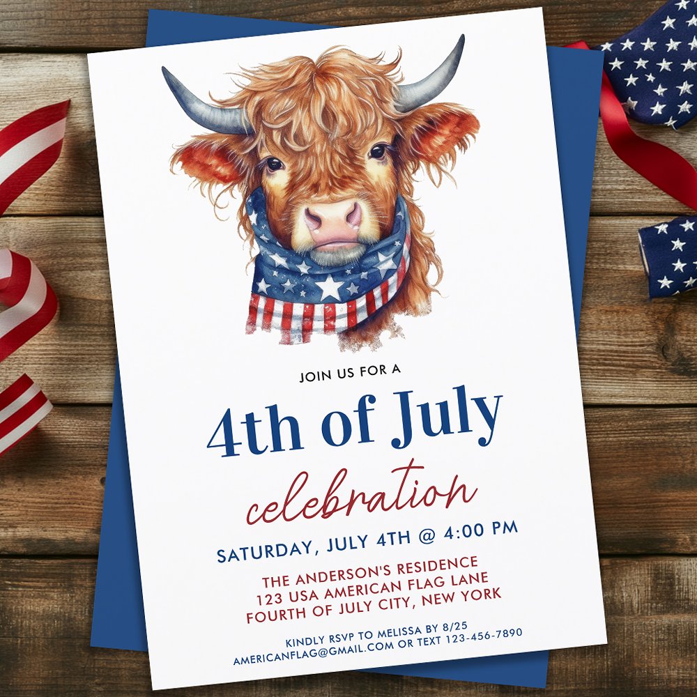 Highland Cow 4th of July Invitation Celebrate Independence Day with a touch of rustic charm! Our Highland Cow 4th of July Invitation is the perfect way to invite your friends and family to a festive gathering on your homestead. Featuring an adorable highland cow sporting a patriotic ensemble of red, white, and blue, this invitation embodies the spirit of a true American celebration. Features Charming Design: The invitation showcases a cute highland cow wearing a festive American flag bandana, set against a backdrop of rustic farm elements. It's sure to bring a smile to your guests' faces. Patriotic Theme: With vibrant hues of red, white, and blue, this invitation captures the essence of the 4th of July, making it ideal for any patriotic celebration. High-Quality Material: Printed on premium cardstock, these invitations are durable and have a professional finish, ensuring they look impressive and feel substantial. Customizable Text: Easily personalize the invitation with your event details, including date, time, and location, to make it uniquely yours. Perfect For Farmers and Homesteaders: Invite your fellow farmers or homesteaders to join in the festivities with a design that resonates with your lifestyle. Family Gatherings: Whether you're hosting a backyard barbecue or a grand family reunion, this invitation is a delightful way to bring everyone together. Patriotic Celebrations: Celebrate America's independence with a touch of country charm, perfect for anyone who loves the great outdoors and farm life. Let the Highland Cow 4th of July Invitation be the start of a memorable celebration filled with laughter, joy, and patriotism. Order now and spread the festive cheer!