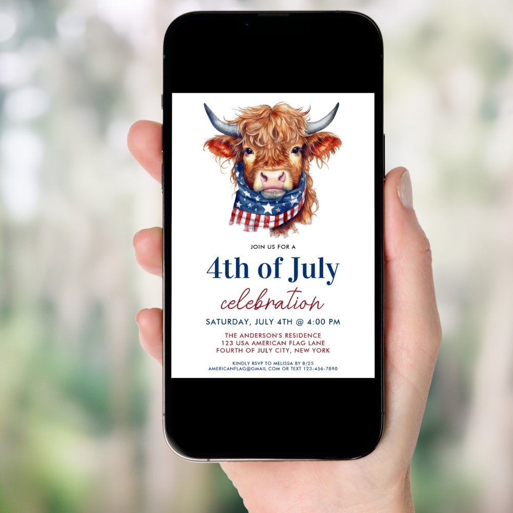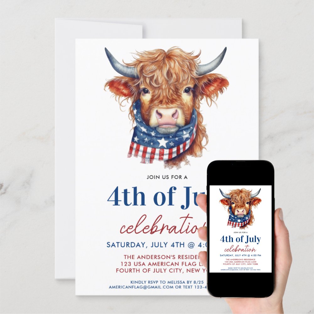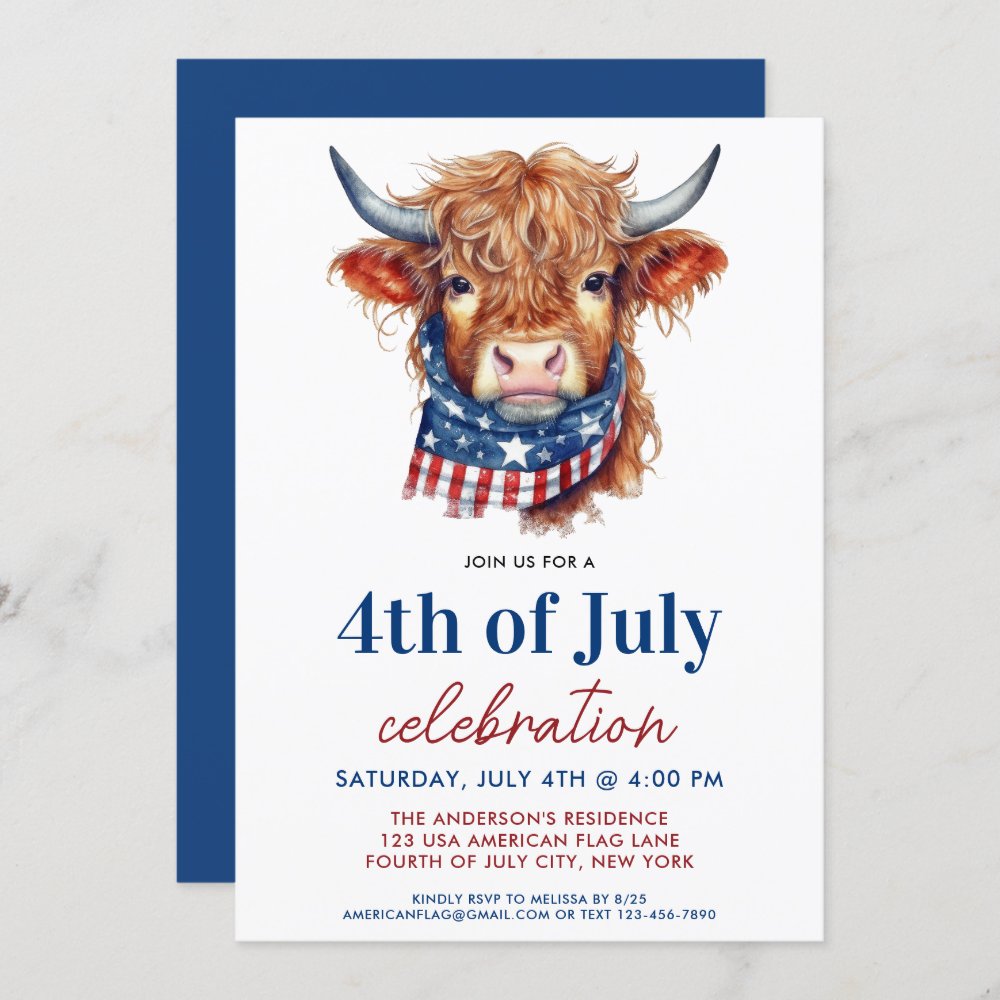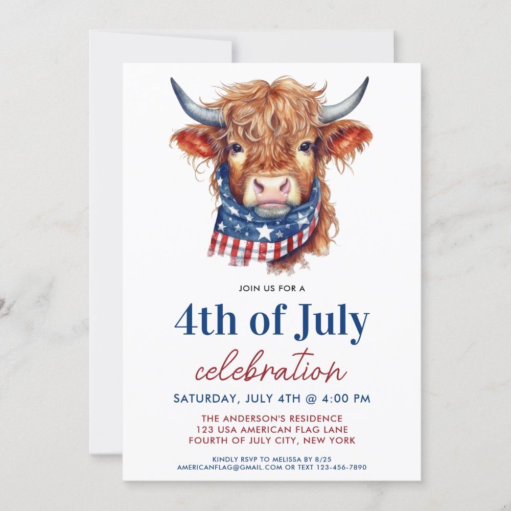 Highland Cow 4th of July Invitation Celebrate Independence Day with a touch of rustic charm! Our Highland Cow 4th of July Invitation is the perfect way to invite your friends and family to a festive gathering on your homestead. Featuring an adorable highland cow sporting a patriotic ensemble of red, white, and blue, this invitation embodies the spirit of a true American celebration. Features Charming Design: The invitation showcases a cute highland cow wearing a festive American flag bandana, set against a backdrop of rustic farm elements. It's sure to bring a smile to your guests' faces. Patriotic Theme: With vibrant hues of red, white, and blue, this invitation captures the essence of the 4th of July, making it ideal for any patriotic celebration. High-Quality Material: Printed on premium cardstock, these invitations are durable and have a professional finish, ensuring they look impressive and feel substantial. Customizable Text: Easily personalize the invitation with your event details, including date, time, and location, to make it uniquely yours. Perfect For Farmers and Homesteaders: Invite your fellow farmers or homesteaders to join in the festivities with a design that resonates with your lifestyle. Family Gatherings: Whether you're hosting a backyard barbecue or a grand family reunion, this invitation is a delightful way to bring everyone together. Patriotic Celebrations: Celebrate America's independence with a touch of country charm, perfect for anyone who loves the great outdoors and farm life. Let the Highland Cow 4th of July Invitation be the start of a memorable celebration filled with laughter, joy, and patriotism. Order now and spread the festive cheer!