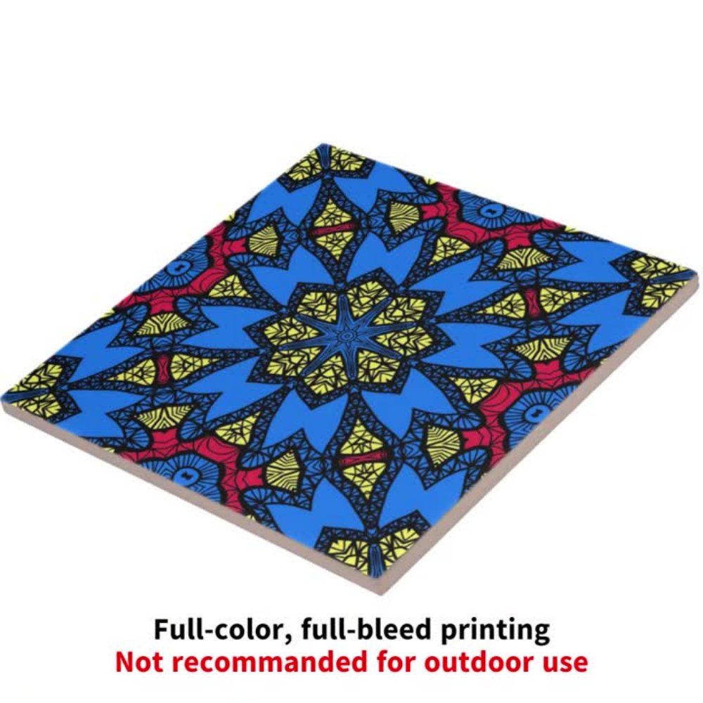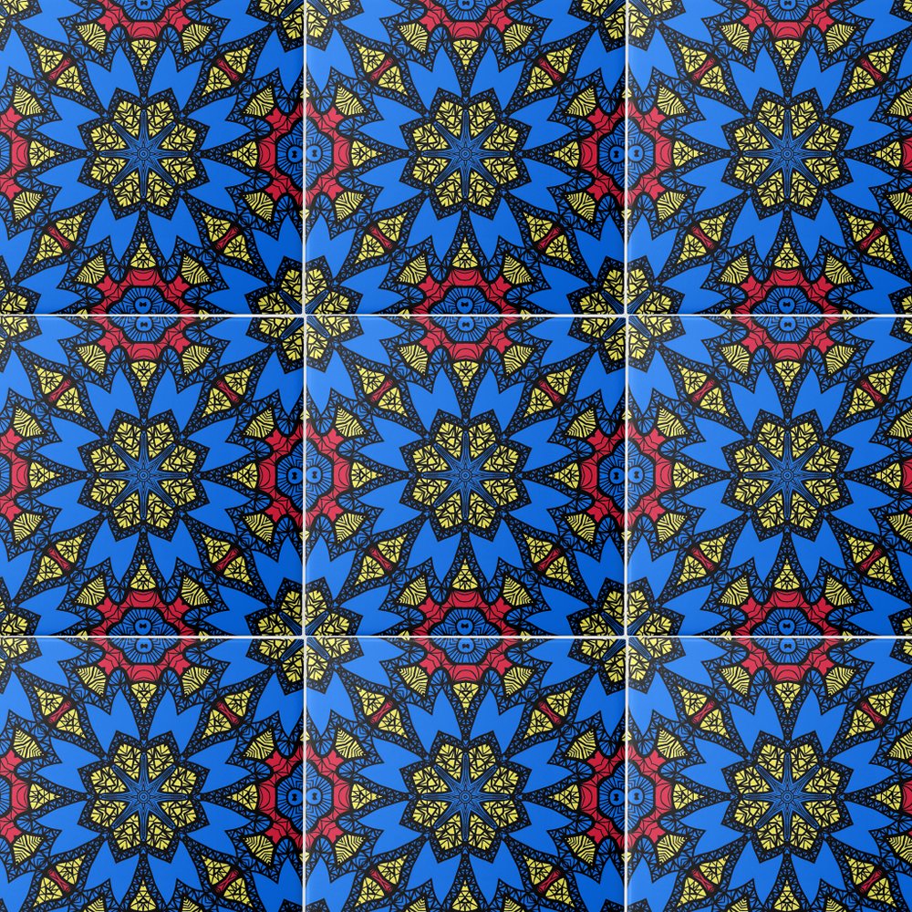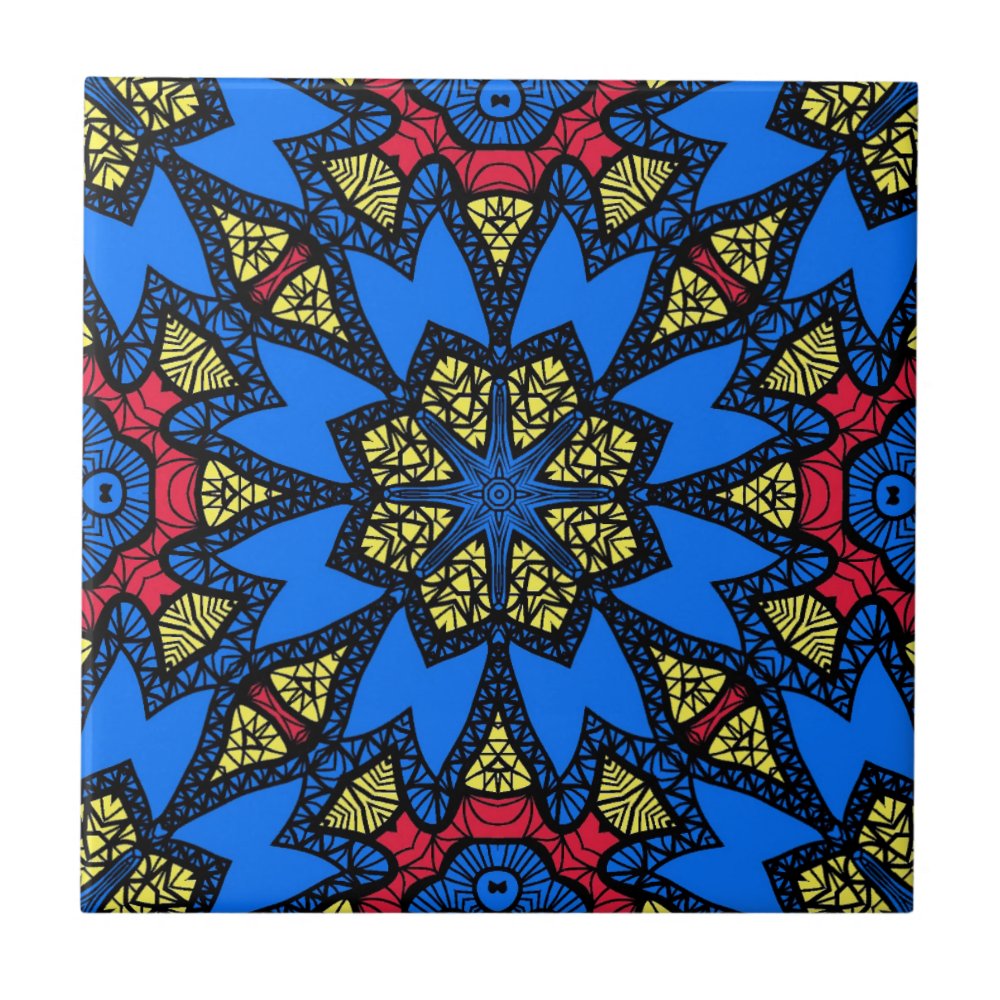 blue red yellow, african ethnic design, geometric pattern, symmetrical shapes, complex starburst, kitchen backsplash, decorative ceramic home accents, mosaic wall tiles, modern bathroom decor, vibrant color scheme