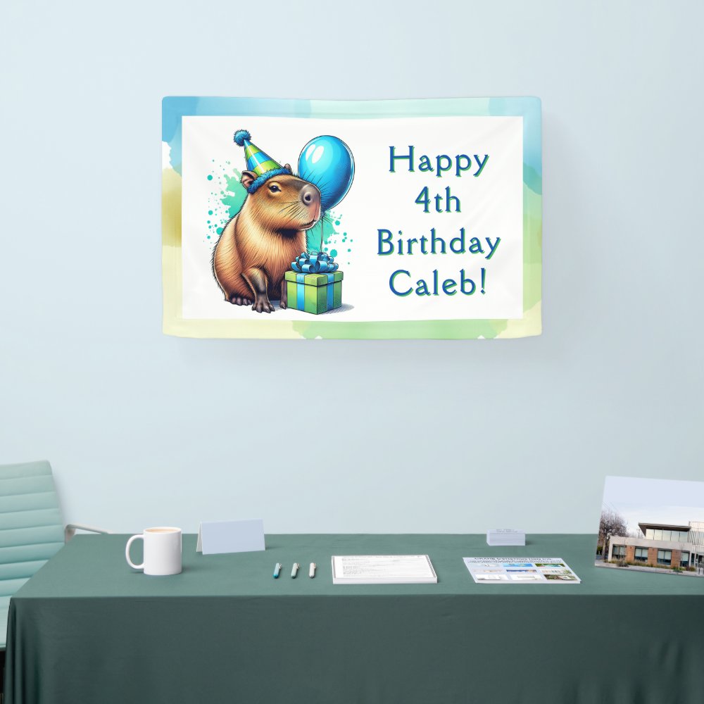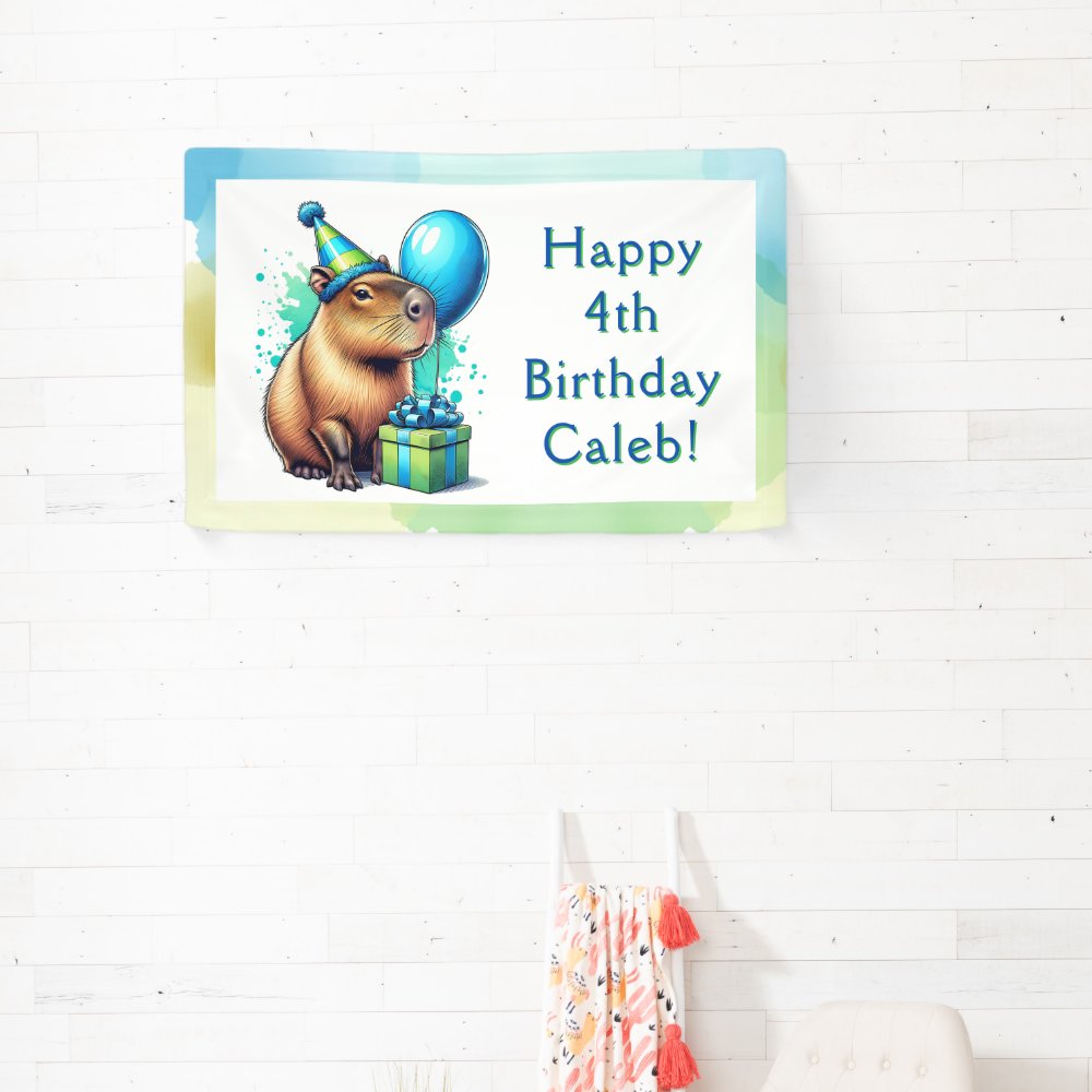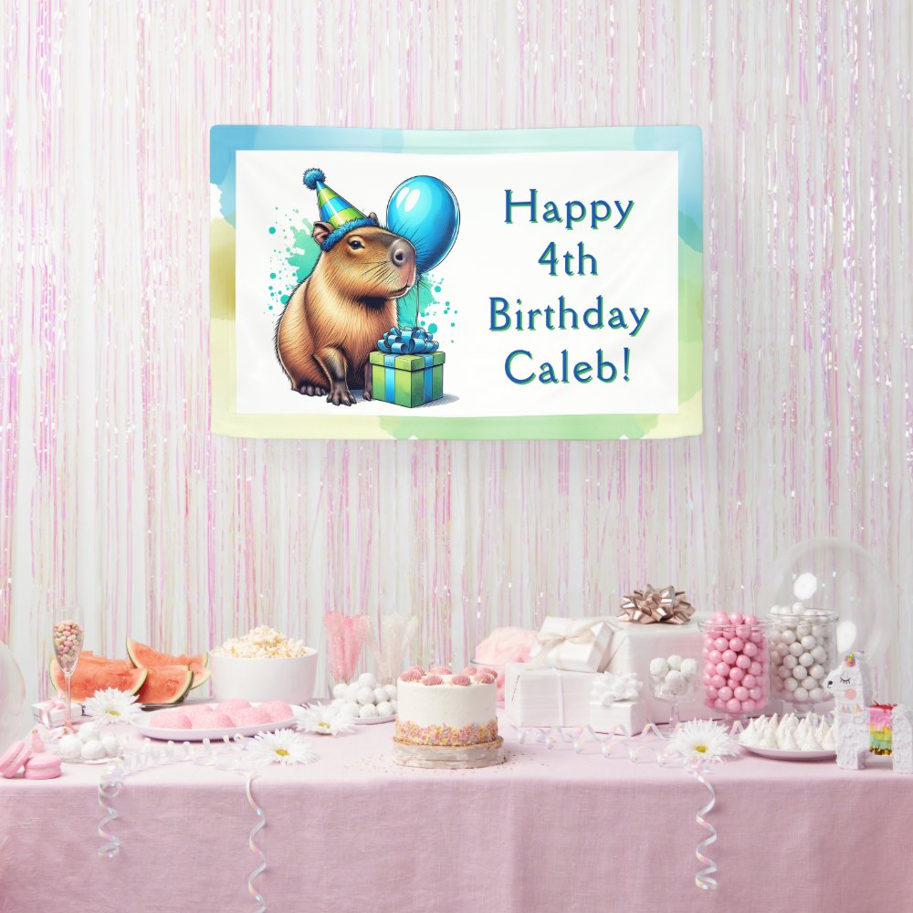 Blue and Green capybara themed boy's Birthday Party personalized banner. A watercolor capybara holding a balloon and birthday gift. Cute for kids of any age!
