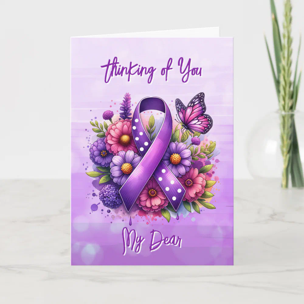 MCAS card to show a friend or family member know that you care and are there to help ifo they need it. Cute purple awareness ribbon, butterfly and flowers for MCAS Mast Cell Activation Syndrome. Purple polka dot ribbon.