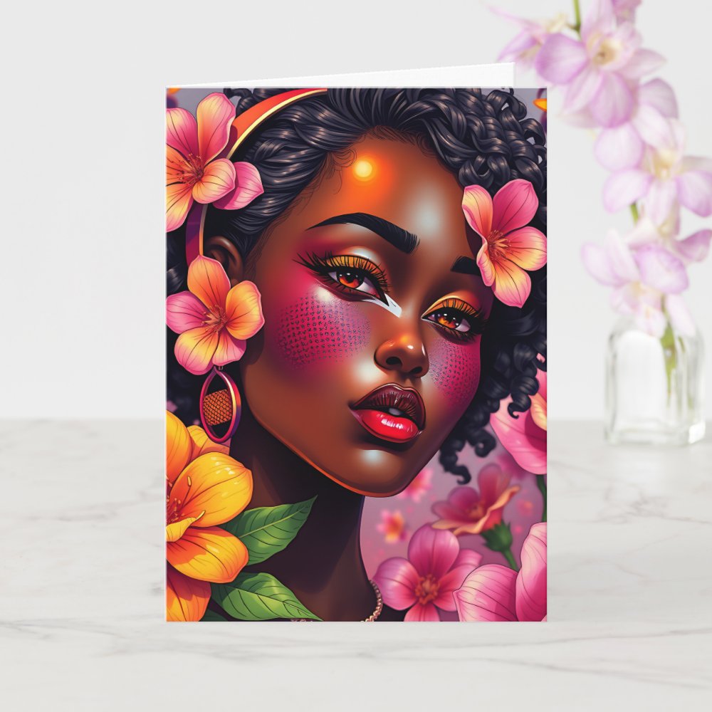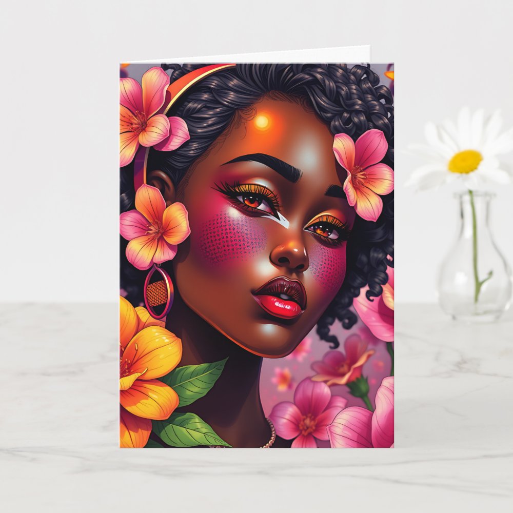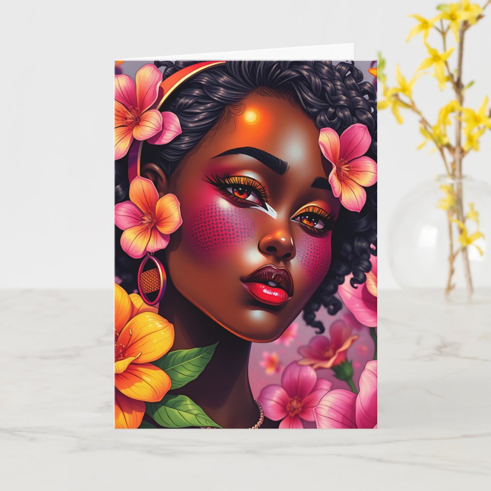 Birthday card for her. Cool ai art depicting a pretty African-American woman with yellow and pink flowers in her hair surrounded by pink and yellow flowers and musical notes. Pretty hyper realistic digital art.