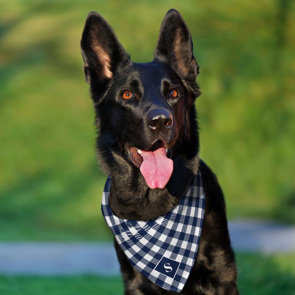 buffalo plaid, custom dog or cat bandana, custom monogrammed pet initial, cute pet accessory, personalized pet collar, stylish dog cat gift, dog cat lover gift, custom pet fashion, adorable dog cat accessory, navy and white