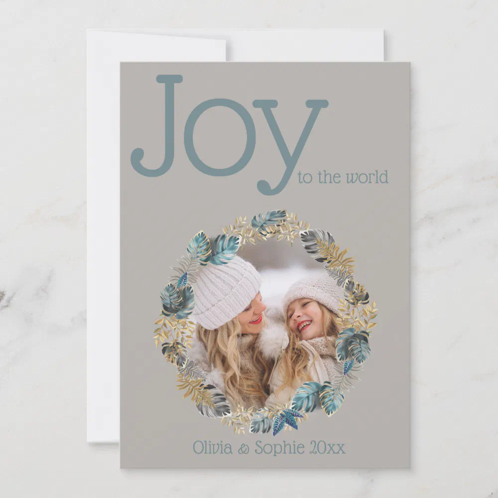Trending shades of dusty blue and gold philodendron foliage surrounding a round photo frame with a mushroom gray background. Joy to the World in contemporary font (which you can change if you like) . Easy to customize - the reverse is a second place for a favorite photo, ideal for your friends and family to frame!